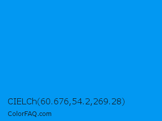 CIELCh 60.676,54.2,269.28 Color is a normal blue color and the nearest color is Vivid Cerulean #00aaee. Hex code #0298f2 and RGB value is rgb(2,152,242). In RGB color space, this color is composed of 1% red, 60% green, 95% blue, In CMYK color space, this color is composed of 99% cyan, 37% magenta, 0% yellow , 5% black , In HSL color space, this color has a hue angle of 203° , 98% saturation and 48% lightness.