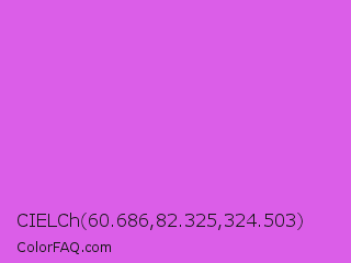 CIELCh 60.686,82.325,324.503 Color is a light magenta color and the nearest color is Orchid #da70d6. Hex code #db5ee8 and RGB value is rgb(219,94,232). In RGB color space, this color is composed of 86% red, 37% green, 91% blue, In CMYK color space, this color is composed of 6% cyan, 59% magenta, 0% yellow , 9% black , In HSL color space, this color has a hue angle of 294° , 75% saturation and 64% lightness.
