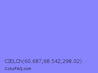 CIELCh 60.687,68.542,298.02 Color is a light indigo color and the nearest color is Portage #8b9fee. Hex code #8884fe and RGB value is rgb(136,132,254). In RGB color space, this color is composed of 53% red, 52% green, 100% blue, In CMYK color space, this color is composed of 46% cyan, 48% magenta, 0% yellow , 0% black , In HSL color space, this color has a hue angle of 242° , 98% saturation and 76% lightness.