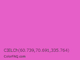 CIELCh 60.739,70.691,335.764 Color is a light magenta color and the nearest color is Light Deep Pink #ff5ccd. Hex code #e65ec7 and RGB value is rgb(230,94,199). In RGB color space, this color is composed of 90% red, 37% green, 78% blue, In CMYK color space, this color is composed of 0% cyan, 59% magenta, 13% yellow , 10% black , In HSL color space, this color has a hue angle of 314° , 73% saturation and 64% lightness.