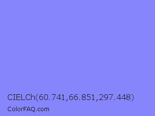CIELCh 60.741,66.851,297.448 Color is a light indigo color and the nearest color is Portage #8b9fee. Hex code #8785fc and RGB value is rgb(135,133,252). In RGB color space, this color is composed of 53% red, 52% green, 99% blue, In CMYK color space, this color is composed of 46% cyan, 47% magenta, 0% yellow , 1% black , In HSL color space, this color has a hue angle of 241° , 95% saturation and 75% lightness.