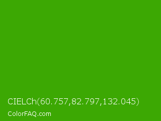 CIELCh 60.757,82.797,132.045 Color is a normal green color and the nearest color is Kelly Green #4cbb17. Hex code #3ca803 and RGB value is rgb(60,168,3). In RGB color space, this color is composed of 24% red, 66% green, 1% blue, In CMYK color space, this color is composed of 64% cyan, 0% magenta, 98% yellow , 34% black , In HSL color space, this color has a hue angle of 99° , 96% saturation and 34% lightness.