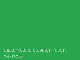 CIELCh 60.75,65.988,144.761 Color is a normal green color and the nearest color is Wageningen Green #34b233. Hex code #28a84b and RGB value is rgb(40,168,75). In RGB color space, this color is composed of 16% red, 66% green, 29% blue, In CMYK color space, this color is composed of 76% cyan, 0% magenta, 55% yellow , 34% black , In HSL color space, this color has a hue angle of 136° , 62% saturation and 41% lightness.