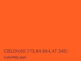 CIELCh 60.773,84.664,47.345 Color is a normal orange color and the nearest color is Giants Orange #fe5a1d. Hex code #fc5f21 and RGB value is rgb(252,95,33). In RGB color space, this color is composed of 99% red, 37% green, 13% blue, In CMYK color space, this color is composed of 0% cyan, 62% magenta, 87% yellow , 1% black , In HSL color space, this color has a hue angle of 17° , 97% saturation and 56% lightness.