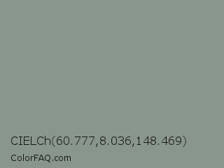 CIELCh 60.777,8.036,148.469 Color is a normal green color and the nearest color is Stack #8a8f8a. Hex code #89968b and RGB value is rgb(137,150,139). In RGB color space, this color is composed of 54% red, 59% green, 55% blue, In CMYK color space, this color is composed of 9% cyan, 0% magenta, 7% yellow , 41% black , In HSL color space, this color has a hue angle of 129° , 6% saturation and 56% lightness.