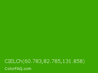 CIELCh 60.783,82.785,131.858 Color is a normal green color and the nearest color is Kelly Green #4cbb17. Hex code #3da802 and RGB value is rgb(61,168,2). In RGB color space, this color is composed of 24% red, 66% green, 1% blue, In CMYK color space, this color is composed of 64% cyan, 0% magenta, 99% yellow , 34% black , In HSL color space, this color has a hue angle of 99° , 98% saturation and 33% lightness.