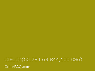 CIELCh 60.784,63.844,100.086 Color is a normal yellow color and the nearest color is Dark Yellow #9b870c. Hex code #9d960a and RGB value is rgb(157,150,10). In RGB color space, this color is composed of 62% red, 59% green, 4% blue, In CMYK color space, this color is composed of 0% cyan, 4% magenta, 94% yellow , 38% black , In HSL color space, this color has a hue angle of 57° , 88% saturation and 33% lightness.