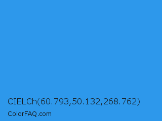 CIELCh 60.793,50.132,268.762 Color is a normal blue color and the nearest color is Button Blue #24a0ed. Hex code #2d98eb and RGB value is rgb(45,152,235). In RGB color space, this color is composed of 18% red, 60% green, 92% blue, In CMYK color space, this color is composed of 81% cyan, 35% magenta, 0% yellow , 8% black , In HSL color space, this color has a hue angle of 206° , 83% saturation and 55% lightness.