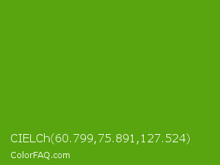 CIELCh 60.799,75.891,127.524 Color is a normal green color and the nearest color is Christi #67a712. Hex code #58a50f and RGB value is rgb(88,165,15). In RGB color space, this color is composed of 35% red, 65% green, 6% blue, In CMYK color space, this color is composed of 47% cyan, 0% magenta, 91% yellow , 35% black , In HSL color space, this color has a hue angle of 91° , 83% saturation and 35% lightness.