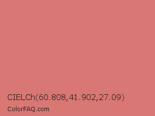 CIELCh 60.808,41.902,27.09 Color is a light red color and the nearest color is Candy Pink #e4717a. Hex code #d87773 and RGB value is rgb(216,119,115). In RGB color space, this color is composed of 85% red, 47% green, 45% blue, In CMYK color space, this color is composed of 0% cyan, 45% magenta, 47% yellow , 15% black , In HSL color space, this color has a hue angle of 2° , 56% saturation and 65% lightness.