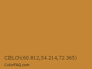 CIELCh 60.812,54.214,72.365 Color is a normal orange color and the nearest color is Bronze #cd7f32. Hex code #c48634 and RGB value is rgb(196,134,52). In RGB color space, this color is composed of 77% red, 53% green, 20% blue, In CMYK color space, this color is composed of 0% cyan, 32% magenta, 73% yellow , 23% black , In HSL color space, this color has a hue angle of 34° , 58% saturation and 49% lightness.