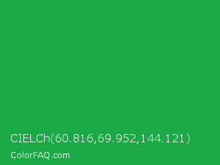 CIELCh 60.816,69.952,144.121 Color is a normal green color and the nearest color is Green Pantone #00ad43. Hex code #1ba945 and RGB value is rgb(27,169,69). In RGB color space, this color is composed of 11% red, 66% green, 27% blue, In CMYK color space, this color is composed of 84% cyan, 0% magenta, 59% yellow , 34% black , In HSL color space, this color has a hue angle of 138° , 72% saturation and 38% lightness.