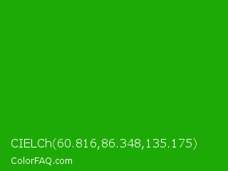 CIELCh 60.816,86.348,135.175 Color is a normal green color and the nearest color is Slimy Green #299617. Hex code #1eaa06 and RGB value is rgb(30,170,6). In RGB color space, this color is composed of 12% red, 67% green, 2% blue, In CMYK color space, this color is composed of 82% cyan, 0% magenta, 96% yellow , 33% black , In HSL color space, this color has a hue angle of 111° , 93% saturation and 35% lightness.