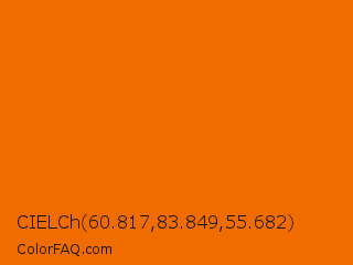 CIELCh 60.817,83.849,55.682 Color is a normal orange color and the nearest color is Clementine #e96e00. Hex code #f06b00 and RGB value is rgb(240,107,0). In RGB color space, this color is composed of 94% red, 42% green, 0% blue, In CMYK color space, this color is composed of 0% cyan, 55% magenta, 100% yellow , 6% black , In HSL color space, this color has a hue angle of 27° , 100% saturation and 47% lightness.