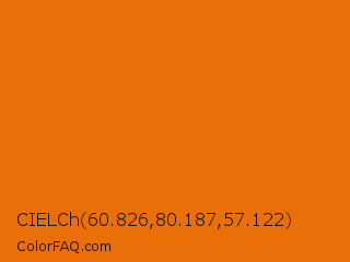 CIELCh 60.826,80.187,57.122 Color is a normal orange color and the nearest color is Christine #e7730a. Hex code #eb6f09 and RGB value is rgb(235,111,9). In RGB color space, this color is composed of 92% red, 44% green, 4% blue, In CMYK color space, this color is composed of 0% cyan, 53% magenta, 96% yellow , 8% black , In HSL color space, this color has a hue angle of 27° , 93% saturation and 48% lightness.