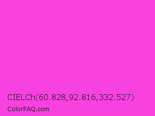CIELCh 60.828,92.816,332.527 Color is a light magenta color and the nearest color is Purple Pizzazz #fe4eda. Hex code #f742e0 and RGB value is rgb(247,66,224). In RGB color space, this color is composed of 97% red, 26% green, 88% blue, In CMYK color space, this color is composed of 0% cyan, 73% magenta, 9% yellow , 3% black , In HSL color space, this color has a hue angle of 308° , 92% saturation and 61% lightness.