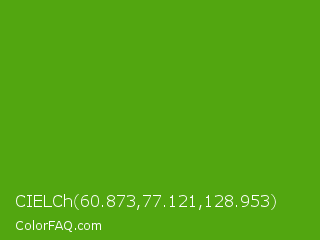 CIELCh 60.873,77.121,128.953 Color is a normal green color and the nearest color is Christi #67a712. Hex code #52a610 and RGB value is rgb(82,166,16). In RGB color space, this color is composed of 32% red, 65% green, 6% blue, In CMYK color space, this color is composed of 51% cyan, 0% magenta, 90% yellow , 35% black , In HSL color space, this color has a hue angle of 94° , 82% saturation and 36% lightness.
