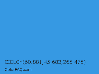 CIELCh 60.881,45.683,265.475 Color is a normal blue color and the nearest color is Tufts Blue #3e8ede. Hex code #3699e3 and RGB value is rgb(54,153,227). In RGB color space, this color is composed of 21% red, 60% green, 89% blue, In CMYK color space, this color is composed of 76% cyan, 33% magenta, 0% yellow , 11% black , In HSL color space, this color has a hue angle of 206° , 76% saturation and 55% lightness.