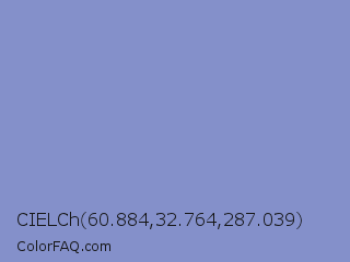 CIELCh 60.884,32.764,287.039 Color is a light blue color and the nearest color is Dark Pastel Blue #779ecb. Hex code #8490ca and RGB value is rgb(132,144,202). In RGB color space, this color is composed of 52% red, 56% green, 79% blue, In CMYK color space, this color is composed of 35% cyan, 29% magenta, 0% yellow , 21% black , In HSL color space, this color has a hue angle of 230° , 40% saturation and 65% lightness.