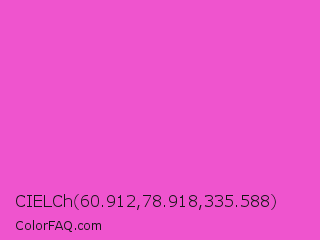 CIELCh 60.912,78.918,335.588 Color is a light magenta color and the nearest color is Light Deep Pink #ff5ccd. Hex code #ef54ce and RGB value is rgb(239,84,206). In RGB color space, this color is composed of 94% red, 33% green, 81% blue, In CMYK color space, this color is composed of 0% cyan, 65% magenta, 14% yellow , 6% black , In HSL color space, this color has a hue angle of 313° , 83% saturation and 63% lightness.