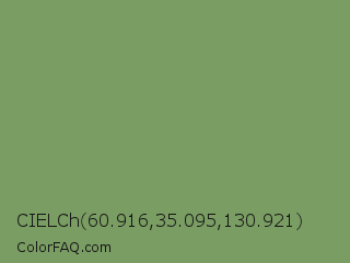 CIELCh 60.916,35.095,130.921 Color is a normal green color and the nearest color is Asparagus Green #7ba05b. Hex code #7a9d63 and RGB value is rgb(122,157,99). In RGB color space, this color is composed of 48% red, 62% green, 39% blue, In CMYK color space, this color is composed of 22% cyan, 0% magenta, 37% yellow , 38% black , In HSL color space, this color has a hue angle of 96° , 23% saturation and 50% lightness.