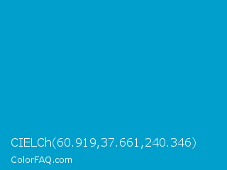 CIELCh 60.919,37.661,240.346 Color is a normal cyan color and the nearest color is Pacific Blue Crayola #009dc4. Hex code #009fcc and RGB value is rgb(0,159,204). In RGB color space, this color is composed of 0% red, 62% green, 80% blue, In CMYK color space, this color is composed of 100% cyan, 22% magenta, 0% yellow , 20% black , In HSL color space, this color has a hue angle of 193° , 100% saturation and 40% lightness.