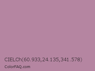 CIELCh 60.933,24.135,341.578 Color is a light magenta color and the nearest color is Opera Mauve #b784a7. Hex code #b585a1 and RGB value is rgb(181,133,161). In RGB color space, this color is composed of 71% red, 52% green, 63% blue, In CMYK color space, this color is composed of 0% cyan, 27% magenta, 11% yellow , 29% black , In HSL color space, this color has a hue angle of 325° , 24% saturation and 62% lightness.