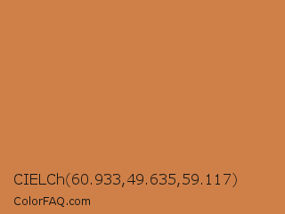 CIELCh 60.933,49.635,59.117 Color is a normal orange color and the nearest color is Raw Sienna Crayola #d27d46. Hex code #cf8048 and RGB value is rgb(207,128,72). In RGB color space, this color is composed of 81% red, 50% green, 28% blue, In CMYK color space, this color is composed of 0% cyan, 38% magenta, 65% yellow , 19% black , In HSL color space, this color has a hue angle of 25° , 58% saturation and 55% lightness.