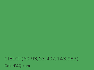 CIELCh 60.93,53.407,143.983 Color is a normal green color and the nearest color is Fruit Salad #4f9d5d. Hex code #4ca559 and RGB value is rgb(76,165,89). In RGB color space, this color is composed of 30% red, 65% green, 35% blue, In CMYK color space, this color is composed of 54% cyan, 0% magenta, 46% yellow , 35% black , In HSL color space, this color has a hue angle of 129° , 37% saturation and 47% lightness.
