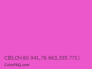 CIELCh 60.941,76.663,335.771 Color is a light magenta color and the nearest color is Light Deep Pink #ff5ccd. Hex code #ed57cc and RGB value is rgb(237,87,204). In RGB color space, this color is composed of 93% red, 34% green, 80% blue, In CMYK color space, this color is composed of 0% cyan, 63% magenta, 14% yellow , 7% black , In HSL color space, this color has a hue angle of 313° , 81% saturation and 64% lightness.