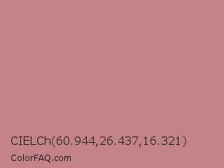CIELCh 60.944,26.437,16.321 Color is a light red color and the nearest color is Old Rose #c08081. Hex code #c28287 and RGB value is rgb(194,130,135). In RGB color space, this color is composed of 76% red, 51% green, 53% blue, In CMYK color space, this color is composed of 0% cyan, 33% magenta, 30% yellow , 24% black , In HSL color space, this color has a hue angle of 355° , 34% saturation and 64% lightness.