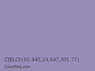 CIELCh 60.945,24.647,301.77 Color is a light indigo color and the nearest color is Amethyst Smoke #a397b4. Hex code #988db8 and RGB value is rgb(152,141,184). In RGB color space, this color is composed of 60% red, 55% green, 72% blue, In CMYK color space, this color is composed of 17% cyan, 23% magenta, 0% yellow , 28% black , In HSL color space, this color has a hue angle of 255° , 23% saturation and 64% lightness.