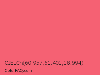CIELCh 60.957,61.401,18.994 Color is a light red color and the nearest color is Wild Watermelon #fd5b78. Hex code #f56173 and RGB value is rgb(245,97,115). In RGB color space, this color is composed of 96% red, 38% green, 45% blue, In CMYK color space, this color is composed of 0% cyan, 60% magenta, 53% yellow , 4% black , In HSL color space, this color has a hue angle of 353° , 88% saturation and 67% lightness.