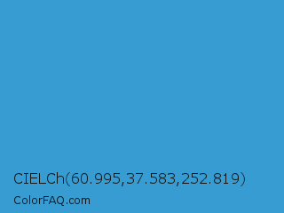 CIELCh 60.995,37.583,252.819 Color is a normal blue color and the nearest color is Celestial Blue #4997d0. Hex code #379cd2 and RGB value is rgb(55,156,210). In RGB color space, this color is composed of 22% red, 61% green, 82% blue, In CMYK color space, this color is composed of 74% cyan, 26% magenta, 0% yellow , 18% black , In HSL color space, this color has a hue angle of 201° , 63% saturation and 52% lightness.