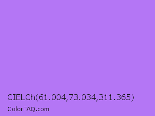 CIELCh 61.004,73.034,311.365 Color is a light violet color and the nearest color is Lavender #b57edc. Hex code #b476f5 and RGB value is rgb(180,118,245). In RGB color space, this color is composed of 71% red, 46% green, 96% blue, In CMYK color space, this color is composed of 27% cyan, 52% magenta, 0% yellow , 4% black , In HSL color space, this color has a hue angle of 269° , 86% saturation and 71% lightness.