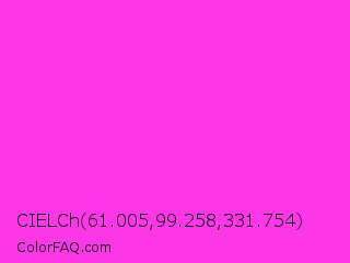 CIELCh 61.005,99.258,331.754 Color is a normal magenta color and the nearest color is Purple Pizzazz #fe4eda. Hex code #fc37e8 and RGB value is rgb(252,55,232). In RGB color space, this color is composed of 99% red, 22% green, 91% blue, In CMYK color space, this color is composed of 0% cyan, 78% magenta, 8% yellow , 1% black , In HSL color space, this color has a hue angle of 306° , 97% saturation and 60% lightness.