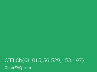 CIELCh 61.015,56.529,153.197 Color is a normal green color and the nearest color is Green Crayola #1cac78. Hex code #22a864 and RGB value is rgb(34,168,100). In RGB color space, this color is composed of 13% red, 66% green, 39% blue, In CMYK color space, this color is composed of 80% cyan, 0% magenta, 40% yellow , 34% black , In HSL color space, this color has a hue angle of 150° , 66% saturation and 40% lightness.