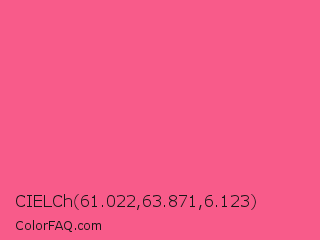 CIELCh 61.022,63.871,6.123 Color is a light rose color and the nearest color is Strawberry #fc5a8d. Hex code #f85b8a and RGB value is rgb(248,91,138). In RGB color space, this color is composed of 97% red, 36% green, 54% blue, In CMYK color space, this color is composed of 0% cyan, 63% magenta, 44% yellow , 3% black , In HSL color space, this color has a hue angle of 342° , 92% saturation and 66% lightness.