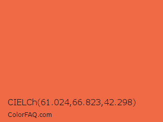 CIELCh 61.024,66.823,42.298 Color is a light red color and the nearest color is Outrageous Orange #ff6e4a. Hex code #f06a46 and RGB value is rgb(240,106,70). In RGB color space, this color is composed of 94% red, 42% green, 27% blue, In CMYK color space, this color is composed of 0% cyan, 56% magenta, 71% yellow , 6% black , In HSL color space, this color has a hue angle of 13° , 85% saturation and 61% lightness.