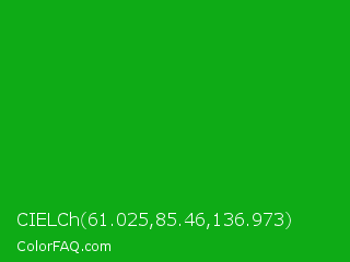 CIELCh 61.025,85.46,136.973 Color is a normal green color and the nearest color is Slimy Green #299617. Hex code #0eab16 and RGB value is rgb(14,171,22). In RGB color space, this color is composed of 5% red, 67% green, 9% blue, In CMYK color space, this color is composed of 92% cyan, 0% magenta, 87% yellow , 33% black , In HSL color space, this color has a hue angle of 123° , 85% saturation and 36% lightness.