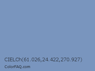 CIELCh 61.026,24.422,270.927 Color is a light blue color and the nearest color is Ship Cove #788bba. Hex code #7995be and RGB value is rgb(121,149,190). In RGB color space, this color is composed of 47% red, 58% green, 75% blue, In CMYK color space, this color is composed of 36% cyan, 22% magenta, 0% yellow , 25% black , In HSL color space, this color has a hue angle of 216° , 35% saturation and 61% lightness.