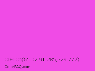 CIELCh 61.02,91.285,329.772 Color is a light magenta color and the nearest color is Purple Pizzazz #fe4eda. Hex code #f04be6 and RGB value is rgb(240,75,230). In RGB color space, this color is composed of 94% red, 29% green, 90% blue, In CMYK color space, this color is composed of 0% cyan, 69% magenta, 4% yellow , 6% black , In HSL color space, this color has a hue angle of 304° , 85% saturation and 62% lightness.