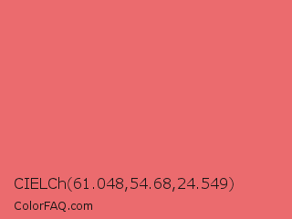 CIELCh 61.048,54.68,24.549 Color is a light red color and the nearest color is Light Carmine Pink #e66771. Hex code #eb6b6e and RGB value is rgb(235,107,110). In RGB color space, this color is composed of 92% red, 42% green, 43% blue, In CMYK color space, this color is composed of 0% cyan, 54% magenta, 53% yellow , 8% black , In HSL color space, this color has a hue angle of 359° , 76% saturation and 67% lightness.