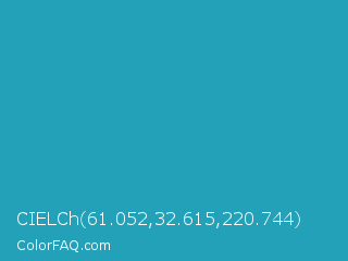 CIELCh 61.052,32.615,220.744 Color is a normal cyan color and the nearest color is Eastern Blue #1e9ab0. Hex code #23a1b8 and RGB value is rgb(35,161,184). In RGB color space, this color is composed of 14% red, 63% green, 72% blue, In CMYK color space, this color is composed of 81% cyan, 13% magenta, 0% yellow , 28% black , In HSL color space, this color has a hue angle of 189° , 68% saturation and 43% lightness.