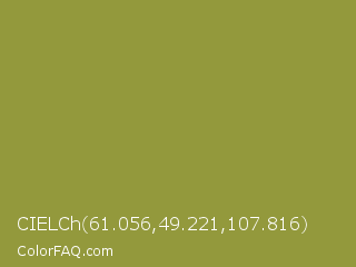 CIELCh 61.056,49.221,107.816 Color is a normal yellow color and the nearest color is Sycamore #908d39. Hex code #93993c and RGB value is rgb(147,153,60). In RGB color space, this color is composed of 58% red, 60% green, 24% blue, In CMYK color space, this color is composed of 4% cyan, 0% magenta, 61% yellow , 40% black , In HSL color space, this color has a hue angle of 64° , 44% saturation and 42% lightness.