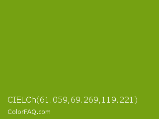 CIELCh 61.059,69.269,119.221 Color is a normal lime color and the nearest color is Christi #67a712. Hex code #75a112 and RGB value is rgb(117,161,18). In RGB color space, this color is composed of 46% red, 63% green, 7% blue, In CMYK color space, this color is composed of 27% cyan, 0% magenta, 89% yellow , 37% black , In HSL color space, this color has a hue angle of 78° , 80% saturation and 35% lightness.