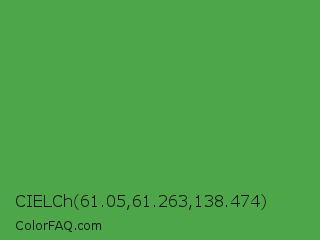 CIELCh 61.05,61.263,138.474 Color is a normal green color and the nearest color is Apple #4fa83d. Hex code #4da647 and RGB value is rgb(77,166,71). In RGB color space, this color is composed of 30% red, 65% green, 28% blue, In CMYK color space, this color is composed of 54% cyan, 0% magenta, 57% yellow , 35% black , In HSL color space, this color has a hue angle of 116° , 40% saturation and 46% lightness.