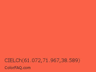 CIELCh 61.072,71.967,38.589 Color is a light red color and the nearest color is Tomato #ff6347. Hex code #f96247 and RGB value is rgb(249,98,71). In RGB color space, this color is composed of 98% red, 38% green, 28% blue, In CMYK color space, this color is composed of 0% cyan, 61% magenta, 71% yellow , 2% black , In HSL color space, this color has a hue angle of 9° , 94% saturation and 63% lightness.