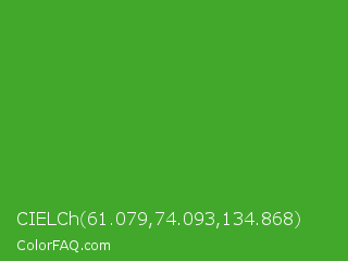 CIELCh 61.079,74.093,134.868 Color is a normal green color and the nearest color is Wageningen Green #34b233. Hex code #42a82b and RGB value is rgb(66,168,43). In RGB color space, this color is composed of 26% red, 66% green, 17% blue, In CMYK color space, this color is composed of 61% cyan, 0% magenta, 74% yellow , 34% black , In HSL color space, this color has a hue angle of 109° , 59% saturation and 41% lightness.