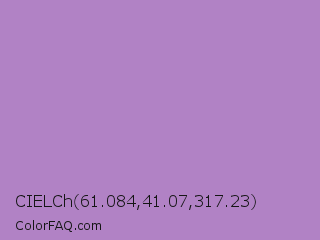CIELCh 61.084,41.07,317.23 Color is a light purple color and the nearest color is African Violet #b284be. Hex code #b182c5 and RGB value is rgb(177,130,197). In RGB color space, this color is composed of 69% red, 51% green, 77% blue, In CMYK color space, this color is composed of 10% cyan, 34% magenta, 0% yellow , 23% black , In HSL color space, this color has a hue angle of 282° , 37% saturation and 64% lightness.